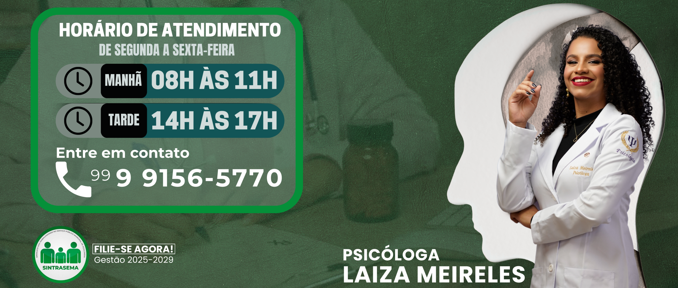 O SINTRASEMA tem o prazer de anunciar mais uma conquista para seus filiados: desde o mês de agosto os servidores sindicalizados que integram o Plano Odontológico Plus poderão agendar atendimentos com profissional da Psicologia. Essa iniciativa da gestão 2025-2029 reforça o compromisso com a saúde mental e o bem-estar dos trabalhadores que dedicam suas vidas ao serviço público.